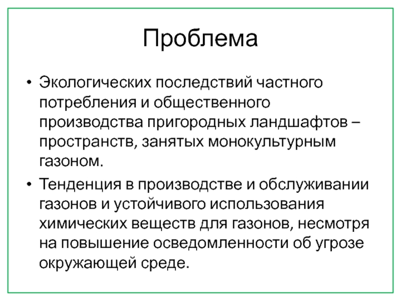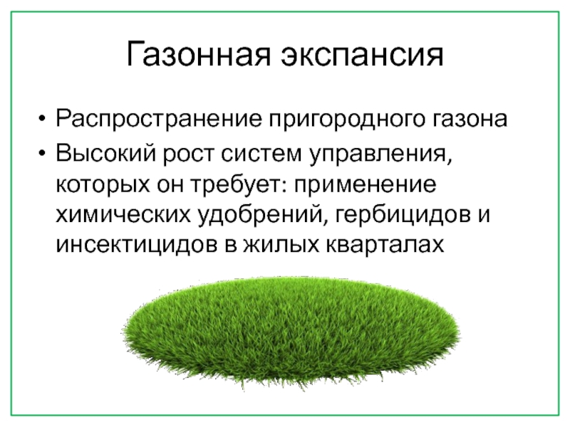 газон с высокими затратами отличается тем, что он представляет собой пример расширяющегося использования химических веществ даже в условиях растущего признания негативных внешних факторов, когда сокращаются все другие формы использования химических веществ.
