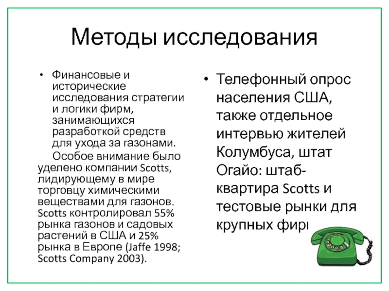 Scotts, лидирующему в мире торговцу химическими веществами для газонов. Scotts контролировал 55% рынка газонов и садовых растений в США и 25% рынка в Европе (Jaffe 1998; Scotts Company 2003).