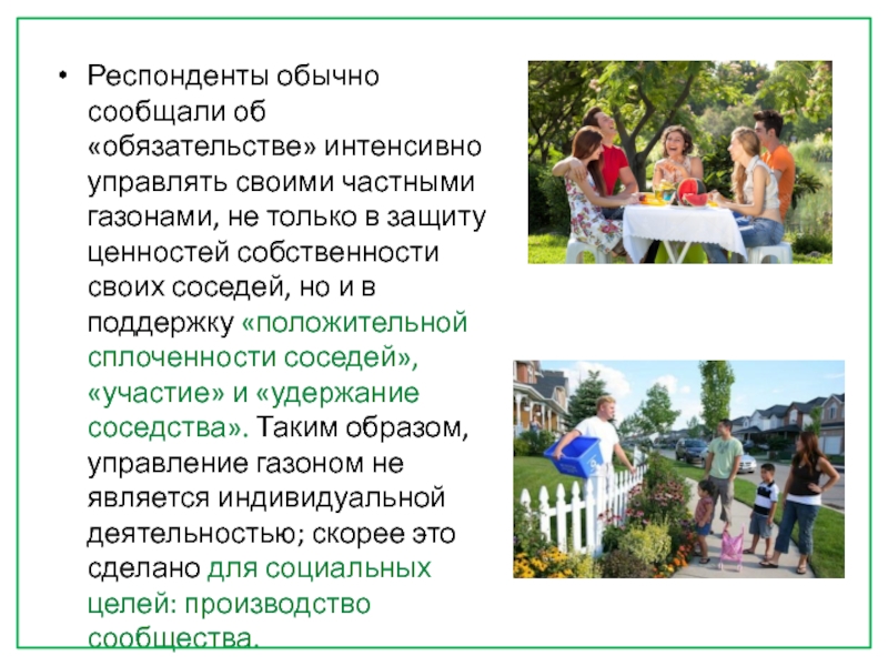 в поддержку «положительной сплоченности соседей», «участие» и «удержание соседства». Таким образом, управление газоном не является индивидуальной деятельностью; скорее это сделано для социальных целей: производство сообщества.