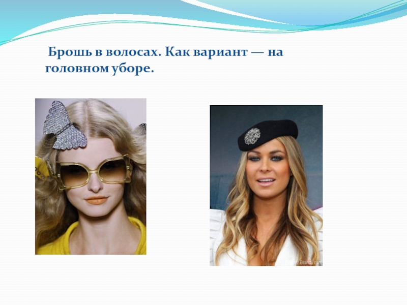 Слайд 12 Брошь в волосах. Как вариант — на головном уборе.