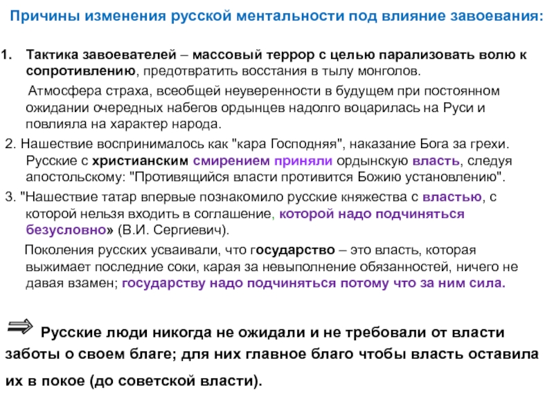 В.И. Сергеевич: «Возможно, в этот период русской истории зародились такие качества, как долготерпение, политическая пассивность, фатализм, ибо чужеземное иго давило самое душу народа. Период подчинения монголам - время суровой духовной дисциплины, неутренней сосредоточенности и аскезы».