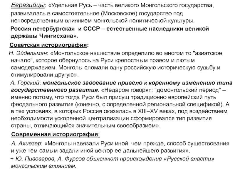 Слайд 18 Евразийцы: «Удельная Русь – часть великого Монгольского государства,