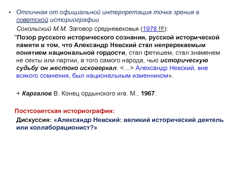 исторического сознания, русской исторической памяти в том, что Александр Невский стал непререкаемым понятием национальной гордости, стал фетишем, стал знаменем не секты или партии, а того самого народа, чью историческую судьбу он жестоко исковеркал. <…> Александр Невский, вне всякого сомнения, был национальным изменником».