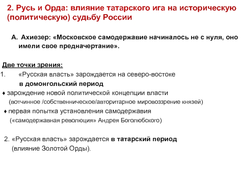 и Орда: влияние татарского ига на историческую (политическую) судьбу России.