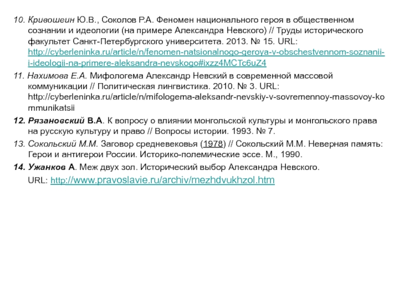 11. Нахимова Е.А. Мифологема Александр Невский в современной массовой коммуникации // Политическая лингвистика. 2010. № 3. URL: http://cyberleninka.ru/article/n/mifologema-aleksandr-nevskiy-v-sovremennoy-massovoy-kommunikatsii