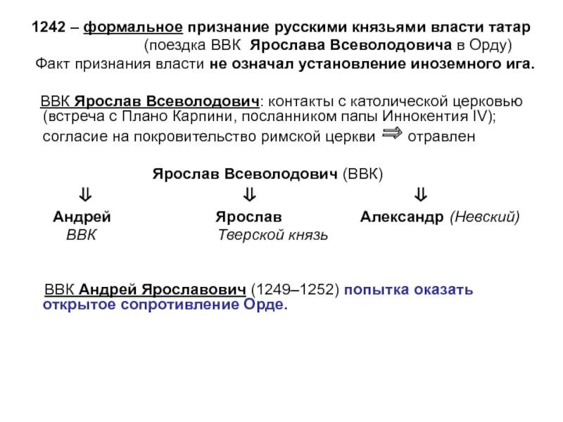 ВВК Ярослав Всеволодович: контакты с католической церковью (встреча с Плано Карпини, посланником папы Иннокентия IV); согласие на покровительство римской церкви отравлен
