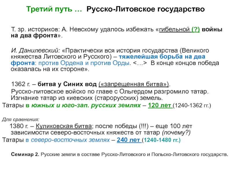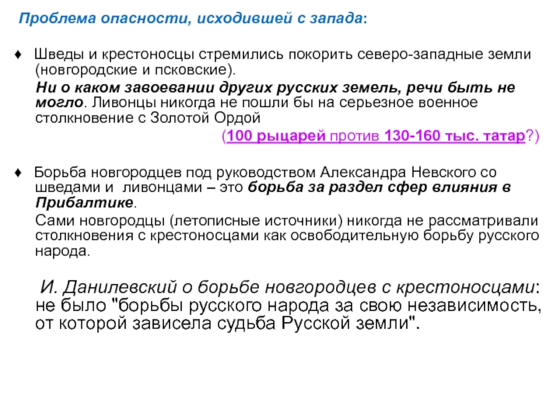 И. Данилевский о борьбе новгородцев с крестоносцами: не было "борьбы русского народа за свою независимость, от которой зависела судьба Русской земли".