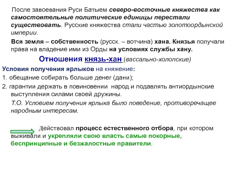 Слайд 20 После завоевания Руси Батыем северо-восточные княжества как