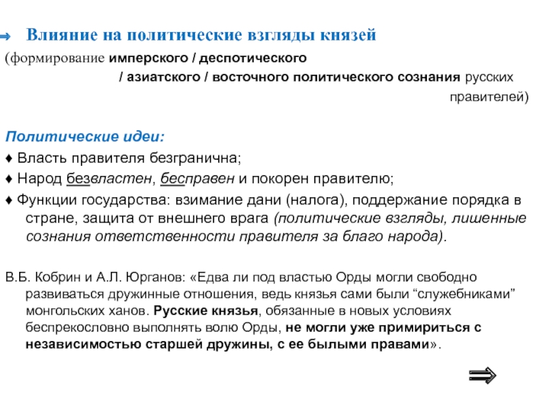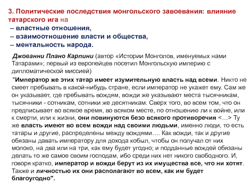 3. Политические последствия монгольского завоевания: влияние на властные отношения, взаимоотношение власти и общества ментальность народа.