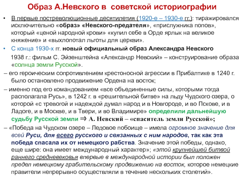 1930-е гг.): тиражировался исключительно «образ» «Невского-предателя», «прислужника попов», который «ценой
