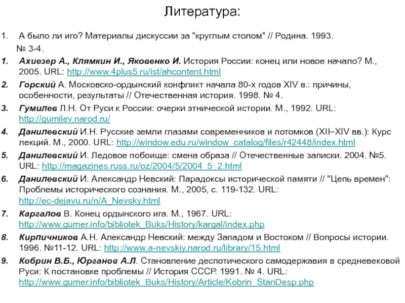 12. Рязановский В.А. К вопросу о влиянии монгольской культуры и монгольского права на русскую культуру и право // Вопросы истории. 1993. № 7.