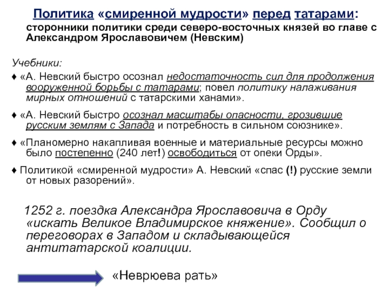 ♦ «А. Невский быстро осознал недостаточность сил для продолжения вооруженной борьбы с татарами; повел политику налаживания мирных отношений с татарскими ханами».