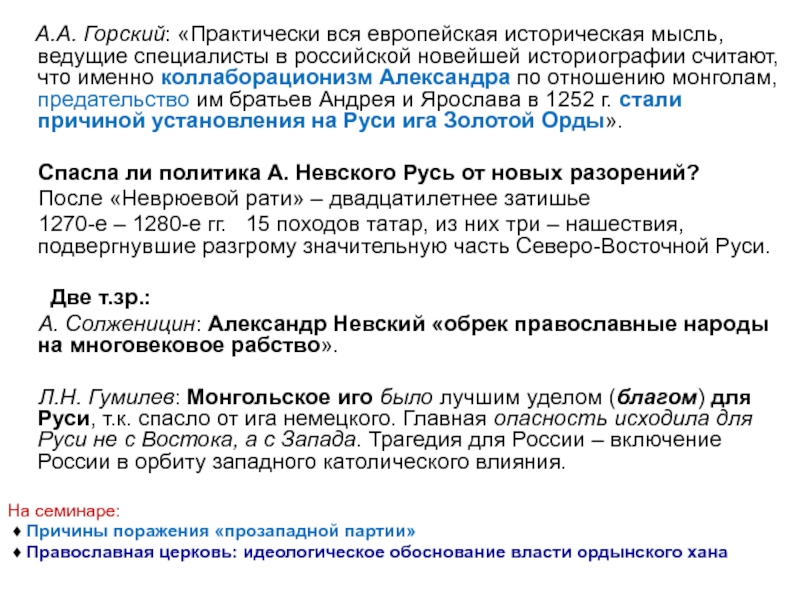 именно коллаборационизм Александра по отношению монголам, предательство им братьев Андрея и Ярослава в 1252 г. стали причиной установления на Руси ига Золотой Орды».