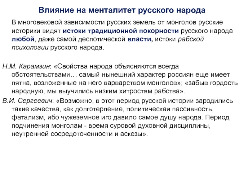 Н.М. Карамзин: «Свойства народа объясняются всегда обстоятельствами… самый нынешний характер россиян еще имеет пятна, возложенные на него варварством монголов»; «забыв гордость народную, мы выучились низким хитростям рабства».
