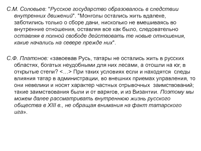 С.Ф. Платонов: «завоевав Русь, татары не остались жить в русских областях, богатых неудобными для них лесами, а отошли на юг, в открытые степи? <…> При таких условиях если и находятся следы влияния татар в администрации, во внешних приемах управления, то они невелики и носят характер частных отрывочных заимствований; такие заимствования были и от варягов, и из Византии. Поэтому мы можем далее рассматривать внутреннюю жизнь русского общества в ХIII в., не обращая внимания на факт татарского ига».