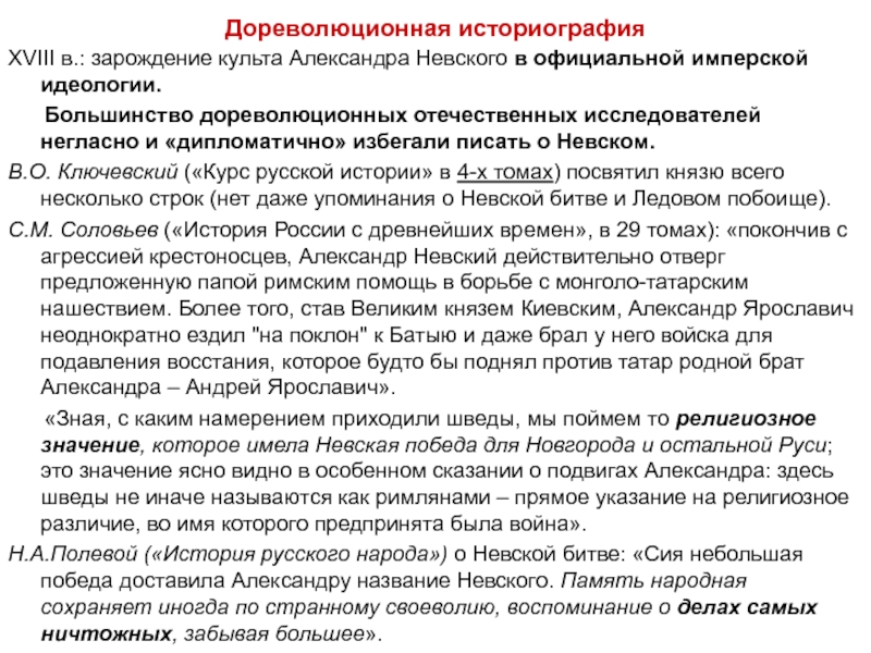 В.О. Ключевский («Курс русской истории» в 4-х томах) посвятил князю всего несколько строк (нет даже упоминания о Невской битве и Ледовом побоище).