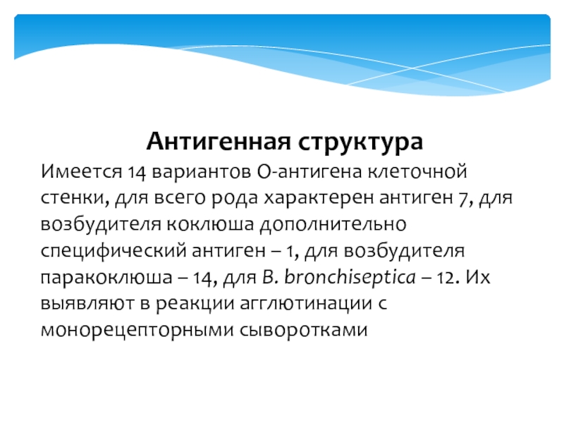 для всего рода характерен антиген 7, для возбудителя коклюша дополнительно специфический антиген – 1, для возбудителя паракоклюша – 14, для B. bronchiseptica – 12. Их выявляют в реакции агглютинации с монорецепторными сыворотками