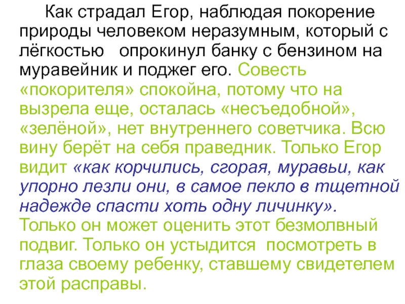 его. Совесть «покорителя» спокойна, потому что на вызрела еще, осталась «несъедобной», «зелёной», нет внутреннего советчика. Всю вину берёт на себя праведник. Только Егор видит «как корчились, сгорая, муравьи, как упорно лезли они, в самое пекло в тщетной надежде спасти хоть одну личинку». Только он может оценить этот безмолвный подвиг. Только он устыдится посмотреть в глаза своему ребенку, ставшему свидетелем этой расправы.