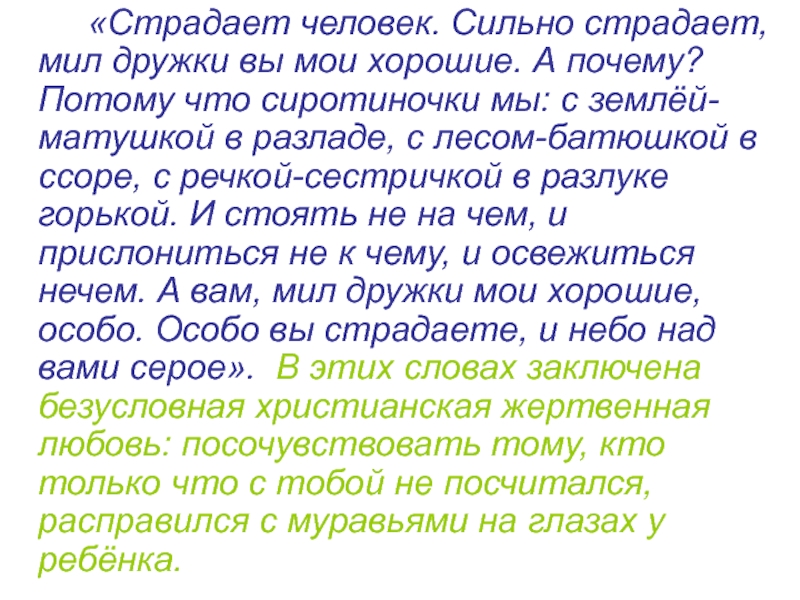 с лесом-батюшкой в ссоре, с речкой-сестричкой в разлуке горькой. И стоять не на чем, и прислониться не к чему, и освежиться нечем. А вам, мил дружки мои хорошие, особо. Особо вы страдаете, и небо над вами серое». В этих словах заключена безусловная христианская жертвенная любовь: посочувствовать тому, кто только что с тобой не посчитался, расправился с муравьями на глазах у ребёнка.