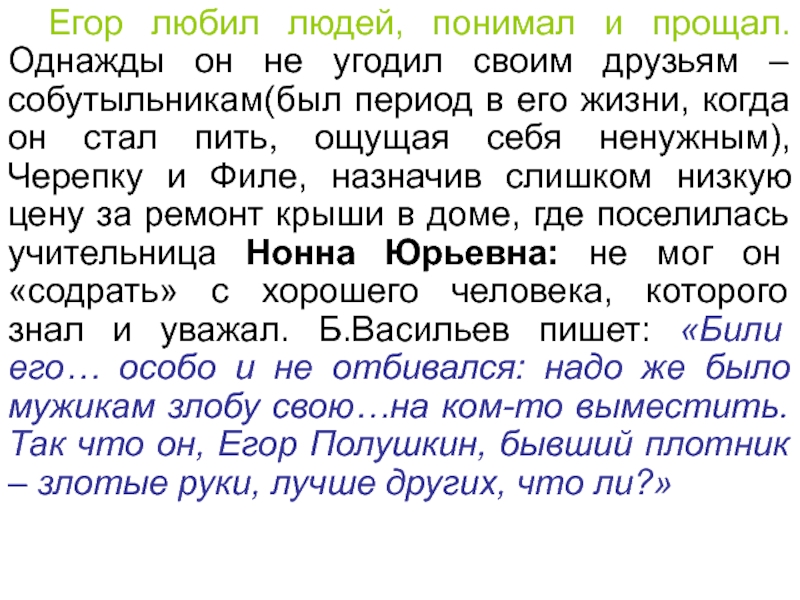 стал пить, ощущая себя ненужным), Черепку и Филе, назначив слишком низкую цену за ремонт крыши в доме, где поселилась учительница Нонна Юрьевна: не мог он «содрать» с хорошего человека, которого знал и уважал. Б.Васильев пишет: «Били его… особо и не отбивался: надо же было мужикам злобу свою…на ком-то выместить. Так что он, Егор Полушкин, бывший плотник – злотые руки, лучше других, что ли?»