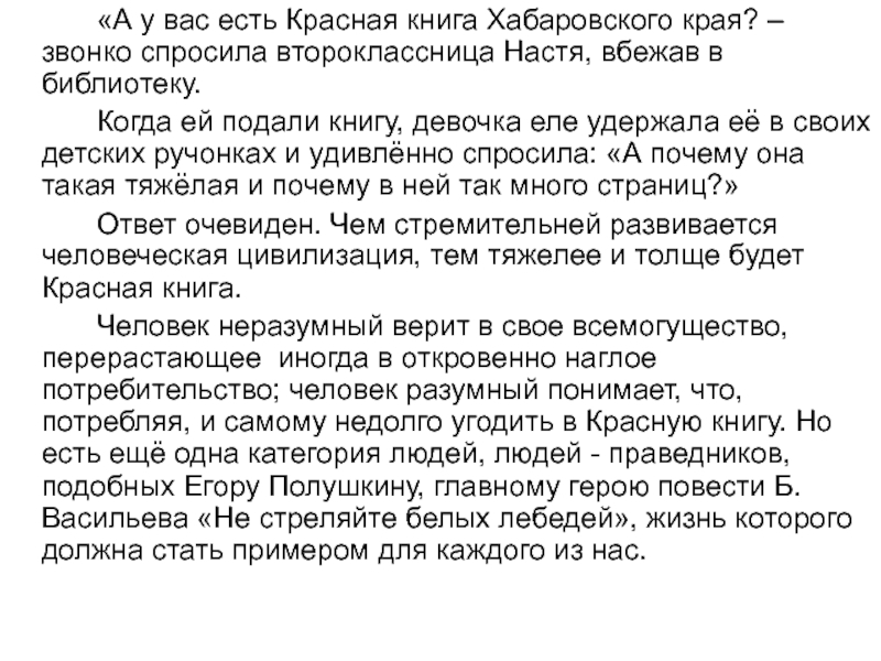 Человек неразумный верит в свое всемогущество, перерастающее иногда в откровенно наглое потребительство; человек разумный понимает, что, потребляя, и самому недолго угодить в Красную книгу. Но есть ещё одна категория людей, людей - праведников, подобных Егору Полушкину, главному герою повести Б. Васильева «Не стреляйте белых лебедей», жизнь которого должна стать примером для каждого из нас.