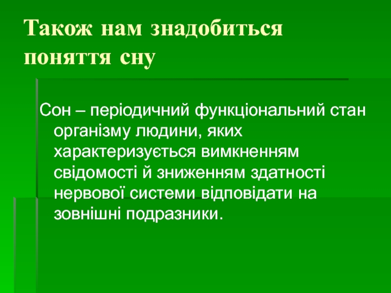 Також нам знадобиться поняття снуСон – періодичний функціональний стан організму людини, яких характеризується вимкненням свідомості й зниженням