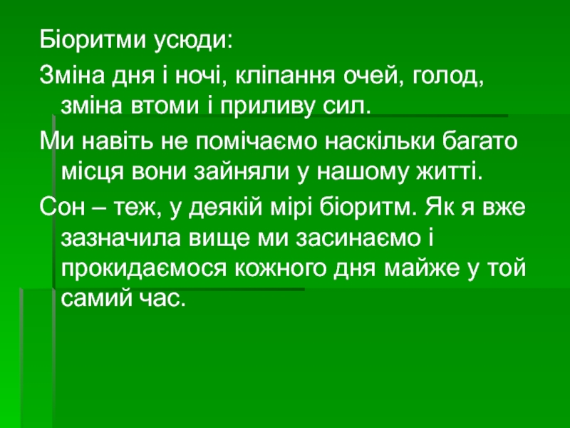 Біоритми усюди:Зміна дня і ночі, кліпання очей, голод, зміна втоми і приливу сил.Ми навіть не помічаємо наскільки
