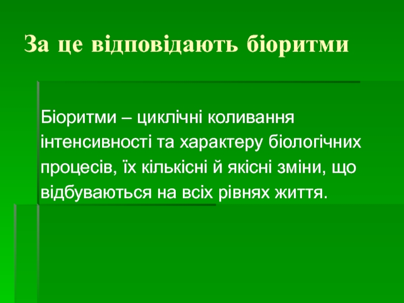 За це відповідають біоритмиБіоритми – циклічні коливанняінтенсивності та характеру біологічнихпроцесів, їх кількісні й якісні зміни, щовідбуваються на