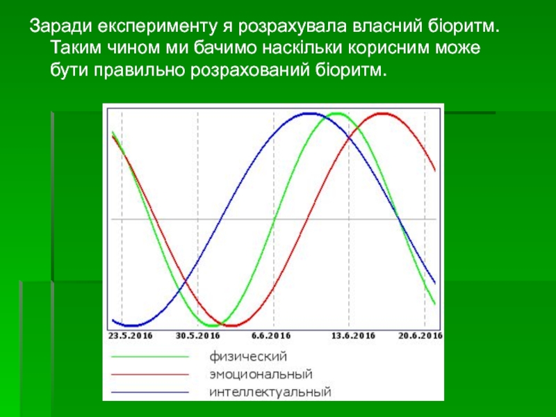 Слайд 6Заради експерименту я розрахувала власний біоритм. Таким чином ми бачимо