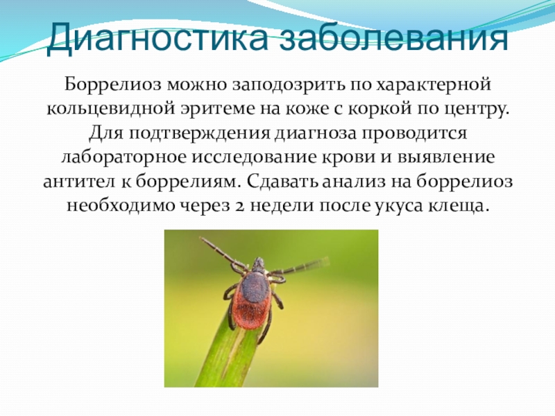 крови и выявление антител к боррелиям. Сдавать анализ на боррелиоз необходимо через 2 недели после укуса клеща.