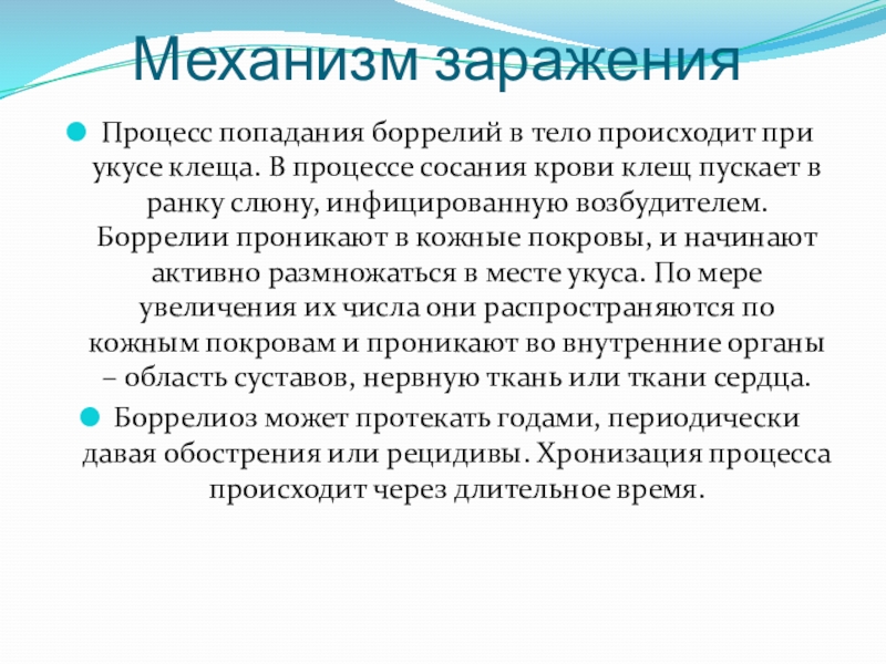 Механизм зараженияПроцесс попадания боррелий в тело происходит при укусе клеща. В процессе сосания крови клещ пускает в