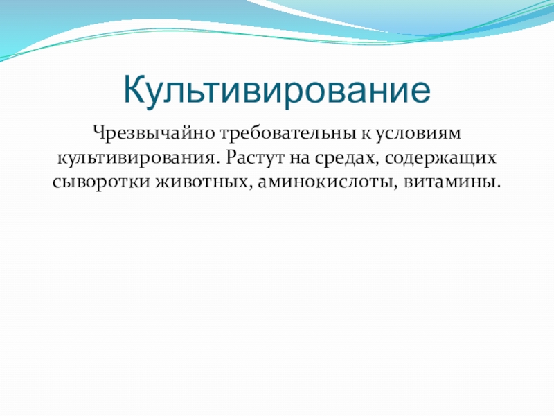 Культивирование Чрезвычайно требовательны к условиям культивирования. Растут на средах, содержащих сыворотки животных, аминокислоты, витамины.