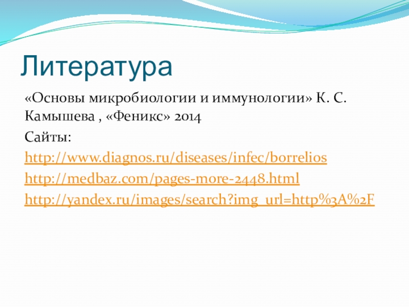 Литература«Основы микробиологии и иммунологии» К. С. Камышева , «Феникс» 2014Сайты:http://www.diagnos.ru/diseases/infec/borrelioshttp://medbaz.com/pages-more-2448.htmlhttp://yandex.ru/images/search?img_url=http%3A%2F