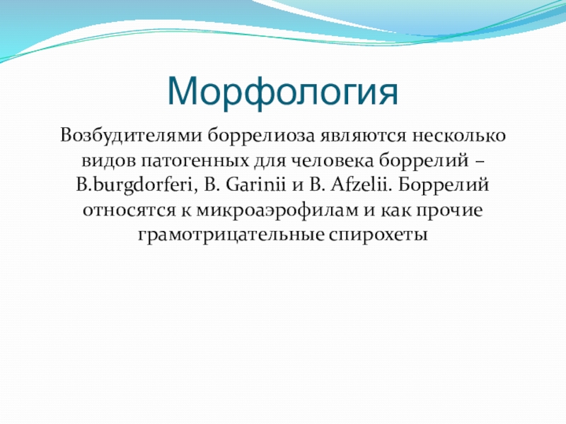 Морфология Возбудителями боррелиоза являются несколько видов патогенных для человека боррелий – В.burgdorferi, В. Garinii и В. Afzelii.