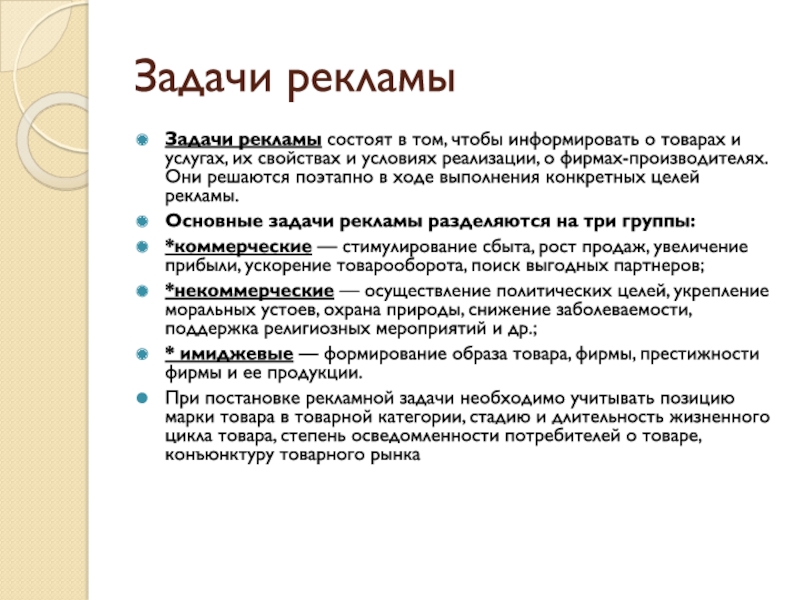 При постановке рекламной задачи необходимо учитывать позицию марки товара в товарной категории, стадию и длительность жизненного цикла товара, степень осведомленности потребителей о товаре, конъюнктуру товарного рынка