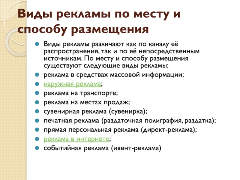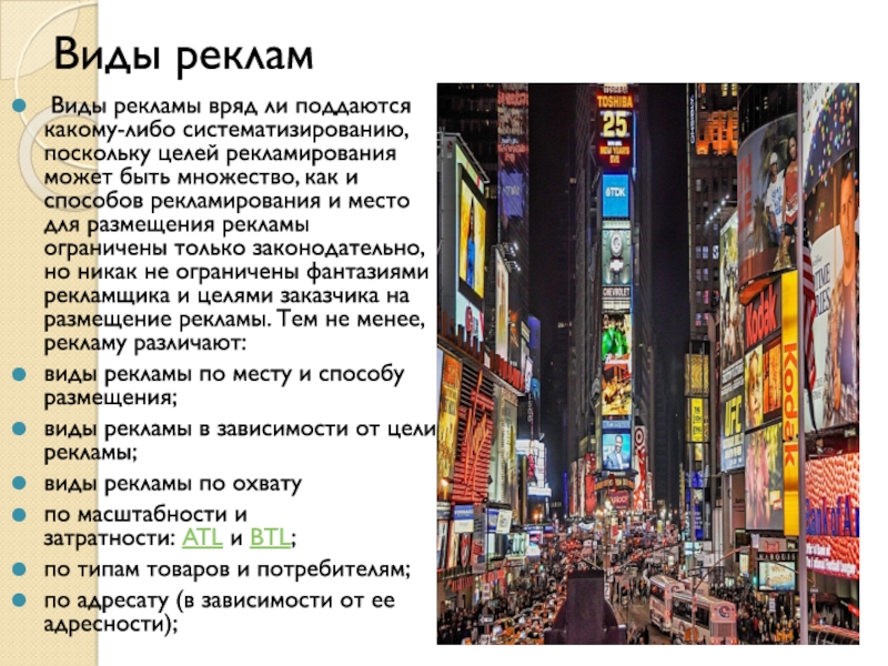 Виды рекламы вряд ли поддаются какому-либо систематизированию, поскольку