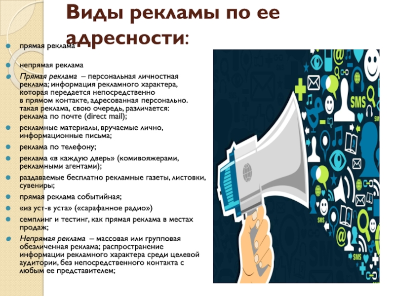 Непрямая реклама – массовая или групповая обезличенная реклама; распространение информации рекламного характера среди целевой аудитории, без непосредственного контакта с любым ее представителем;
