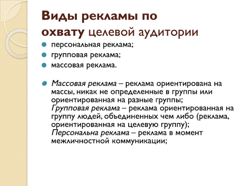 Слайд 8Виды рекламы по охвату целевой аудитории