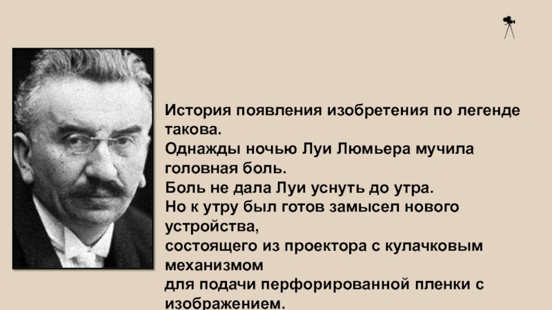 История появления изобретения по легенде такова. Однажды ночью Луи Люмьера мучила головная боль. Боль не дала Луи