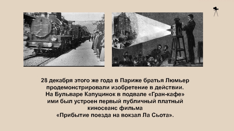 28 декабря этого же года в Париже братья Люмьер продемонстрировали изобретение в действии. На Бульваре Капуцинок в