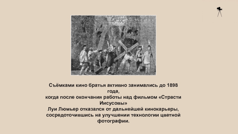 Съёмками кино братья активно занимались до 1898 года, когда после окончания работы над фильмом «Страсти Иисусовы»Луи Люмьер