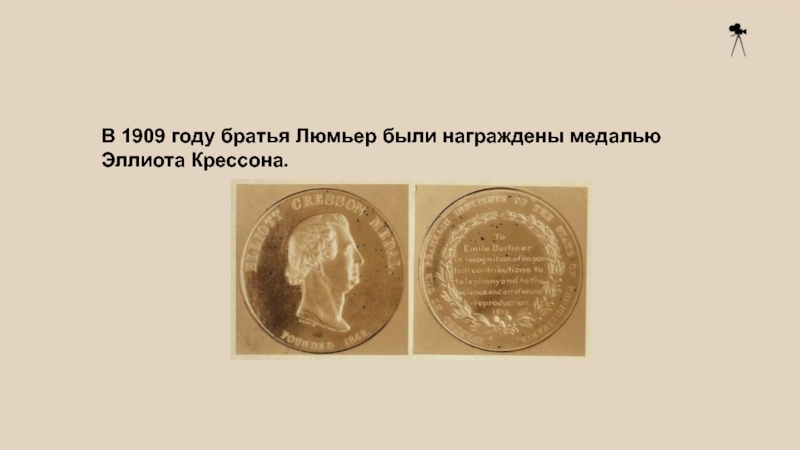 Слайд 9В 1909 году братья Люмьер были награждены медалью Эллиота Крессона.