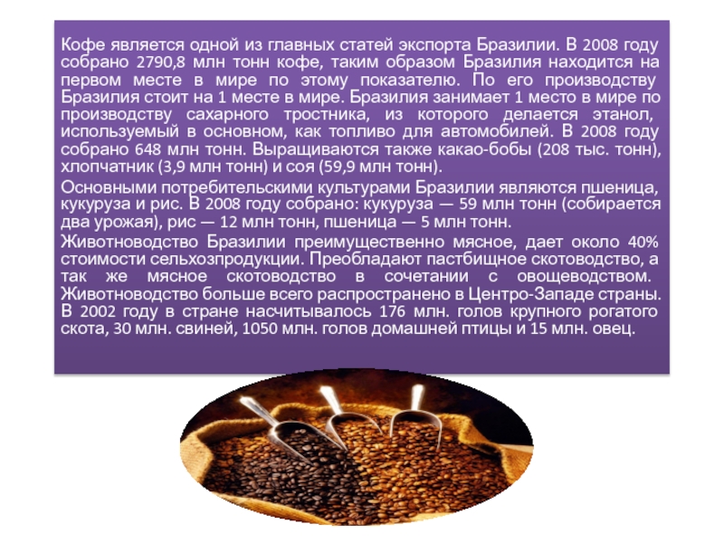 Слайд 9Кофе является одной из главных статей экспорта Бразилии. В 2008