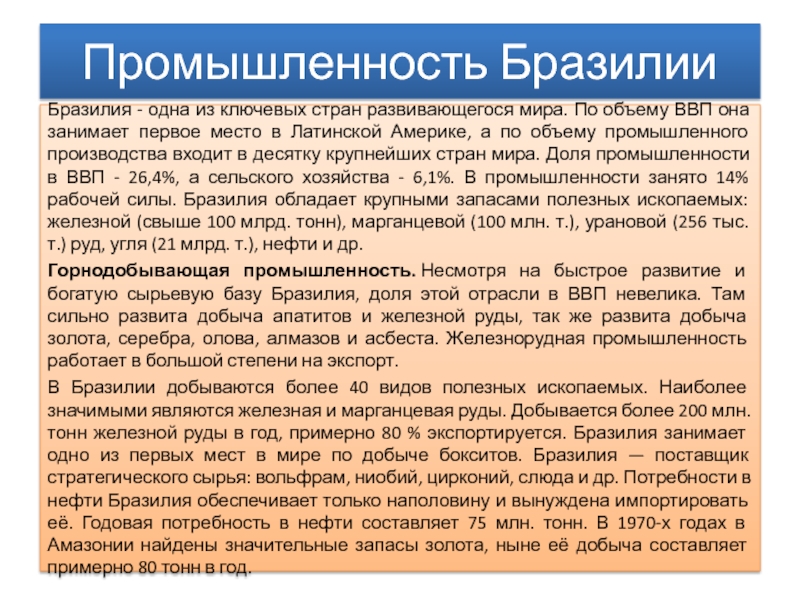 по объему промышленного производства входит в десятку крупнейших стран мира. Доля промышленности в ВВП - 26,4%, а сельского хозяйства - 6,1%. В промышленности занято 14% рабочей силы. Бразилия обладает крупными запасами полезных ископаемых: железной (свыше 100 млрд. тонн), марганцевой (100 млн. т.), урановой (256 тыс. т.) руд, угля (21 млрд. т.), нефти и др.