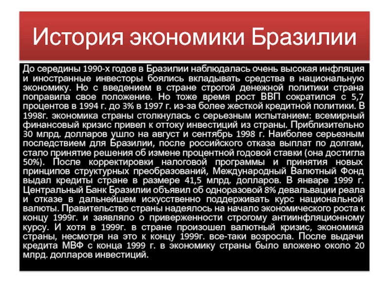 экономику. Но с введением в стране строгой денежной политики страна поправила свое положение. Но тоже время рост ВВП сократился с 5,7 процентов в 1994 г. до 3% в 1997 г. из-за более жесткой кредитной политики. В 1998г. экономика страны столкнулась с серьезным испытанием: всемирный финансовый кризис привел к оттоку инвестиций из страны. Приблизительно 30 млрд. долларов ушло на август и сентябрь 1998 г. Наиболее серьезным последствием для Бразилии, после российского отказа выплат по долгам, стало принятие решения об измене процентной годовой ставки (она достигла 50%). После корректировки налоговой программы и принятия новых принципов структурных преобразований, Международный Валютный Фонд выдал кредиты стране в размере 41,5 млрд. долларов. В январе 1999 г. Центральный Банк Бразилии объявил об одноразовой 8% девальвации реала и отказе в дальнейшем искусственно поддерживать курс национальной валюты. Правительство страны надеялось на начало экономического роста к концу 1999г. и заявляло о приверженности строгому антиинфляционному курсу. И хотя в 1999г. в стране произошел валютный кризис, экономика страны, несмотря на это к концу 1999г. все-таки возросла. После выдачи кредита МВФ с конца 1999 г. в экономику страны было вложено около 20 млрд. долларов инвестиций.