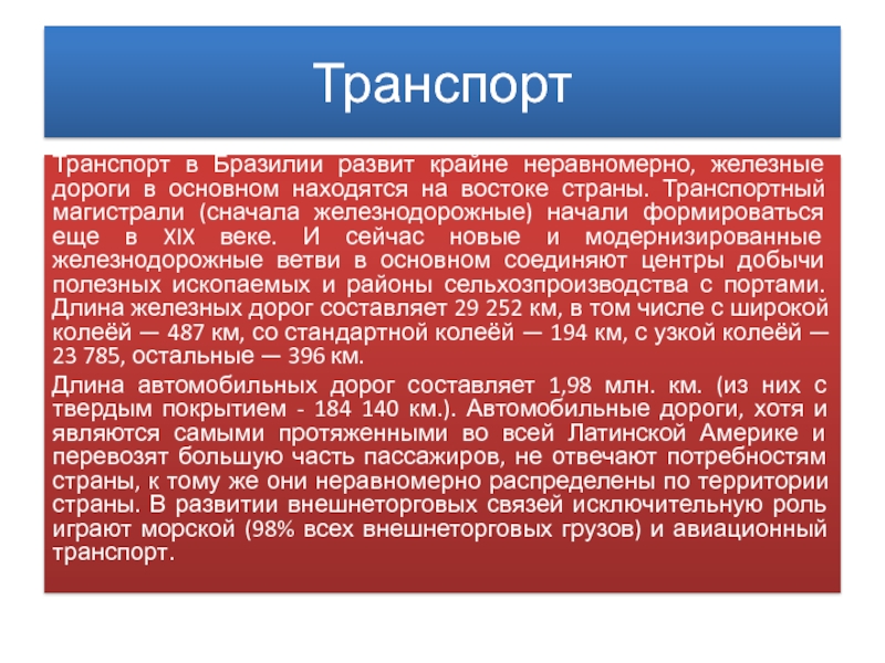 Транспорт в Бразилии развит крайне неравномерно, железные дороги в основном