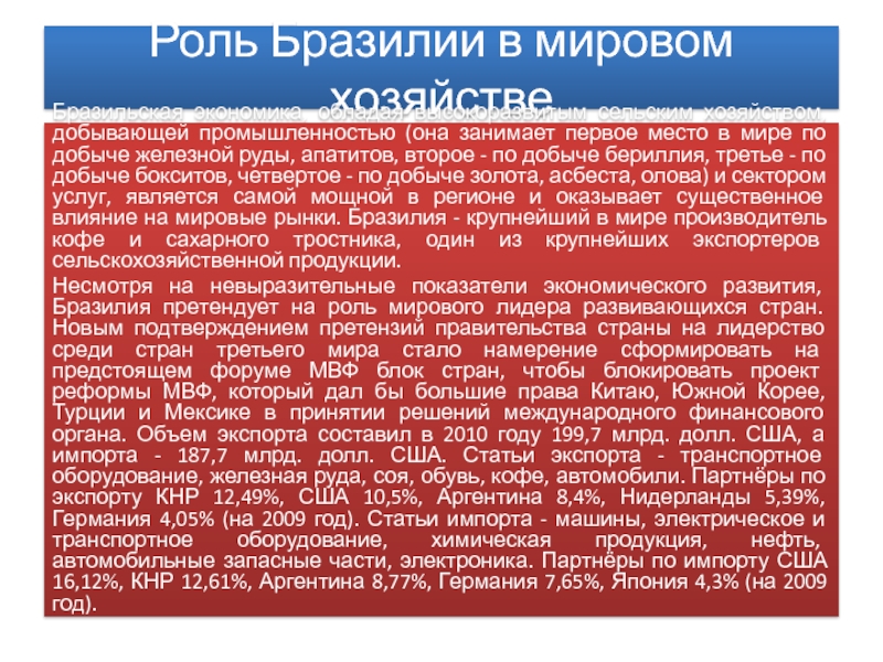Слайд 11Роль Бразилии в мировом хозяйстве
