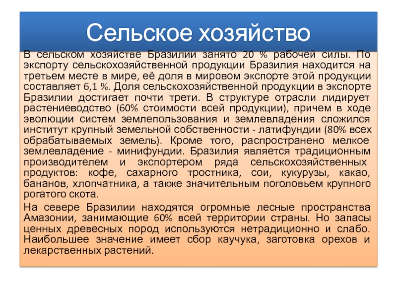 мире, её доля в мировом экспорте этой продукции составляет 6,1 %. Доля сельскохозяйственной продукции в экспорте Бразилии достигает почти трети. В структуре отрасли лидирует растениеводство (60% стоимости всей продукции), причем в ходе эволюции систем землепользования и землевладения сложился институт крупный земельной собственности - латифундии (80% всех обрабатываемых земель). Кроме того, распространено мелкое землевладение - минифундии. Бразилия является традиционным производителем и экспортером ряда сельскохозяйственных продуктов: кофе, сахарного тростника, сои, кукурузы, какао, бананов, хлопчатника, а также значительным поголовьем крупного рогатого скота.