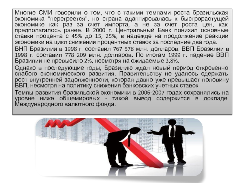 Однако в последующие годы, Бразилию ждал новый период откровенно слабого экономического развития. Правительству не удалось сдержать рост внутренней задолженности, которая давно уже превышает половину ВВП, несмотря на политику снижения банковских учетных ставок