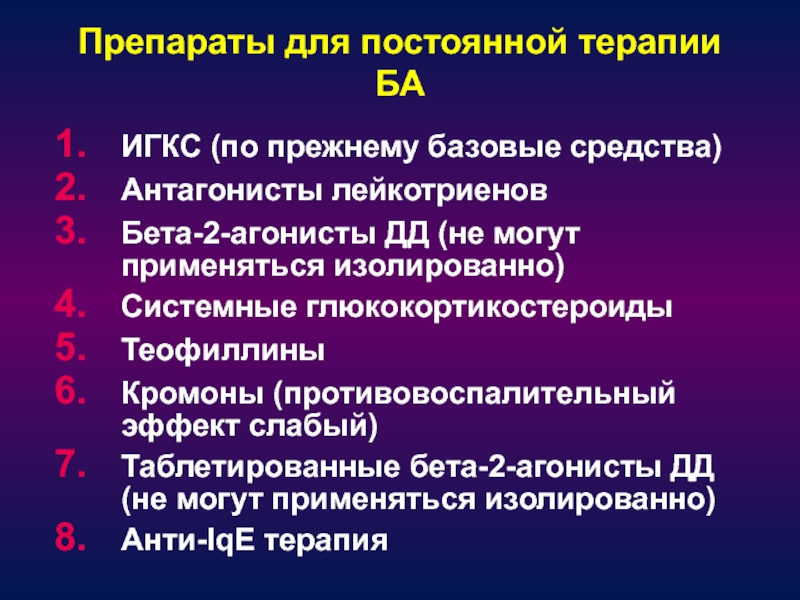 БА с сохранением свистящих хрипов у 40% пациентов. «Гигиеническая гипотеза» - контакт с инфекциями в раннем возрасте способствует развитию иммунной системы по «неаллергическому пути